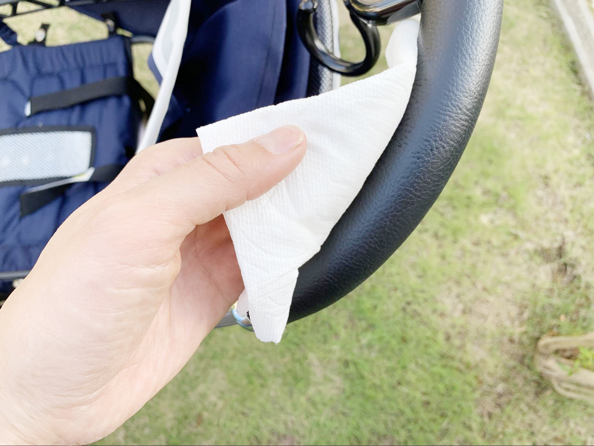 ベビーカーのフレームや日除けなどの外すのに手間がかかるパーツ類は拭いて表面の汚れを落としましょう。