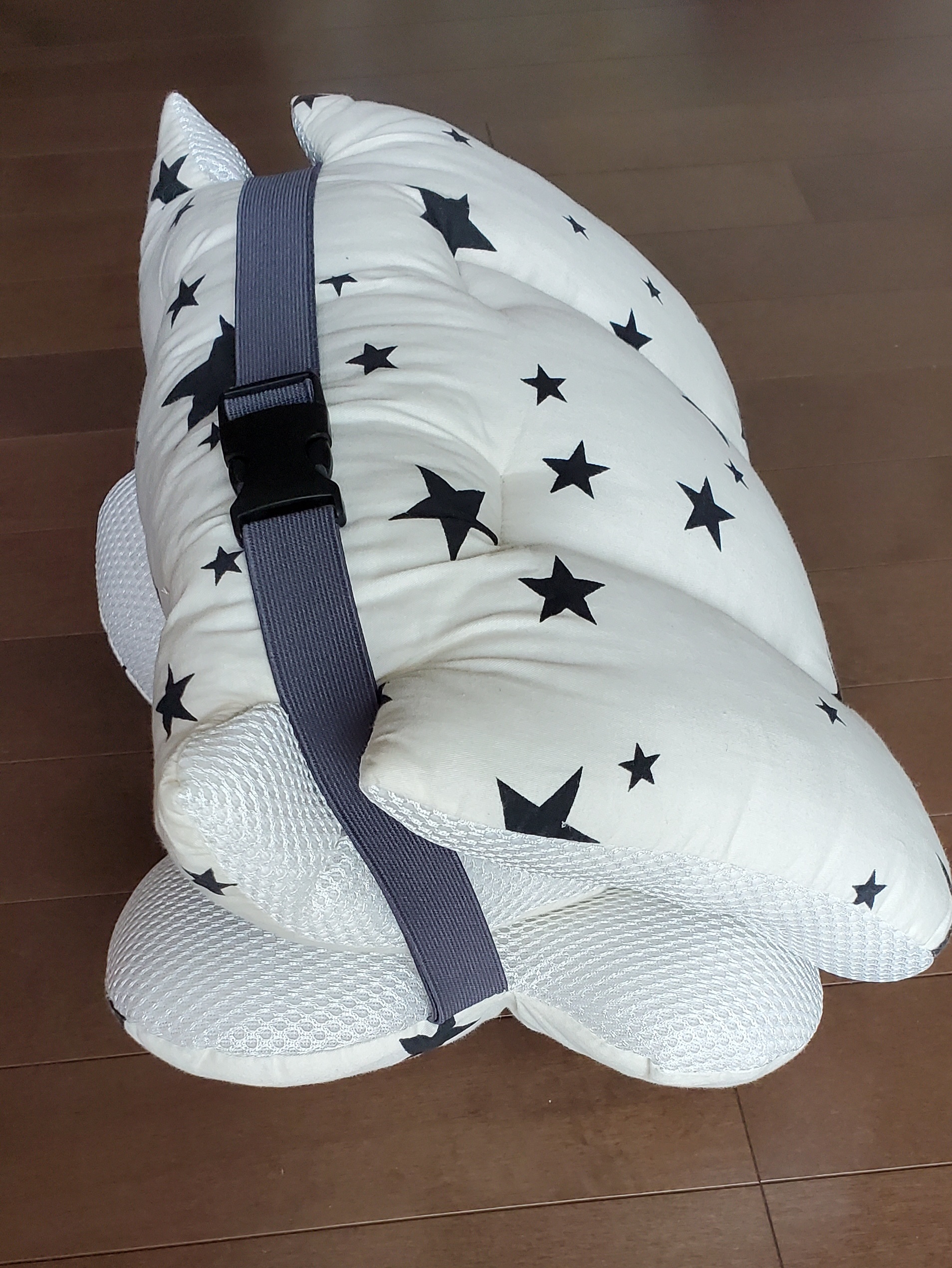 頭部に固定ベルトで、裏面が内側になるように折り畳み、腰ベルトの為の窪みに合わせてゴムを通すと軽く固定が出来ます。(洗濯の間にずれて取れてしまう事多々ありますが・・・)