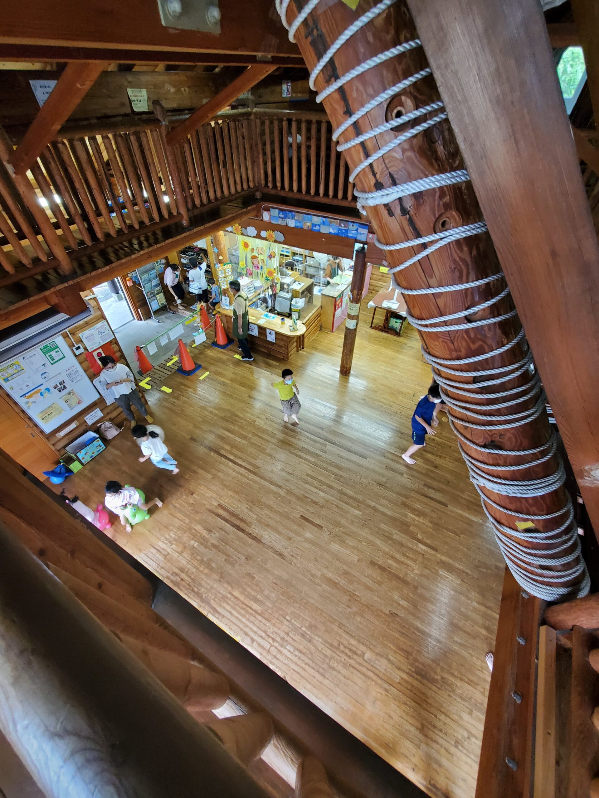外見はログハウスで中はログハウス作りを活かした子供遊べる建物内部全体が遊具になった施設です。