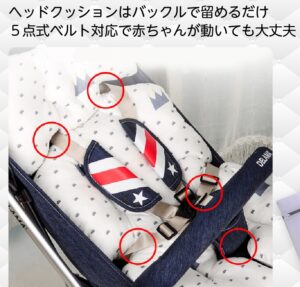 後は、ベビーカーシートの窪み5点にベルトを入れるだけでセットOK!
