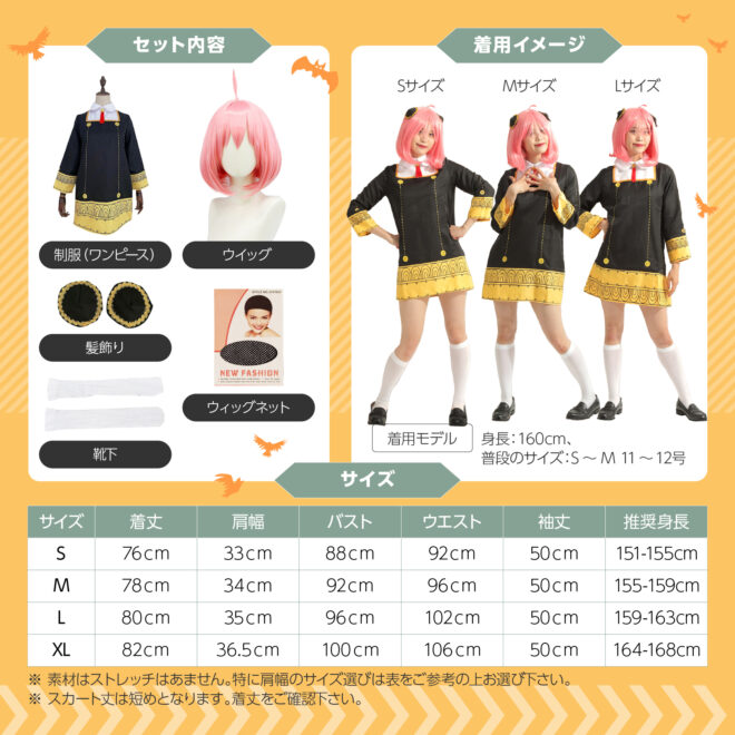 肩回りが、日本の基準サイズより、1~2cm小さめに作られている、スカートの丈がミニとなるので、推奨身長を重点に見てサイズ選びをして下さいね!